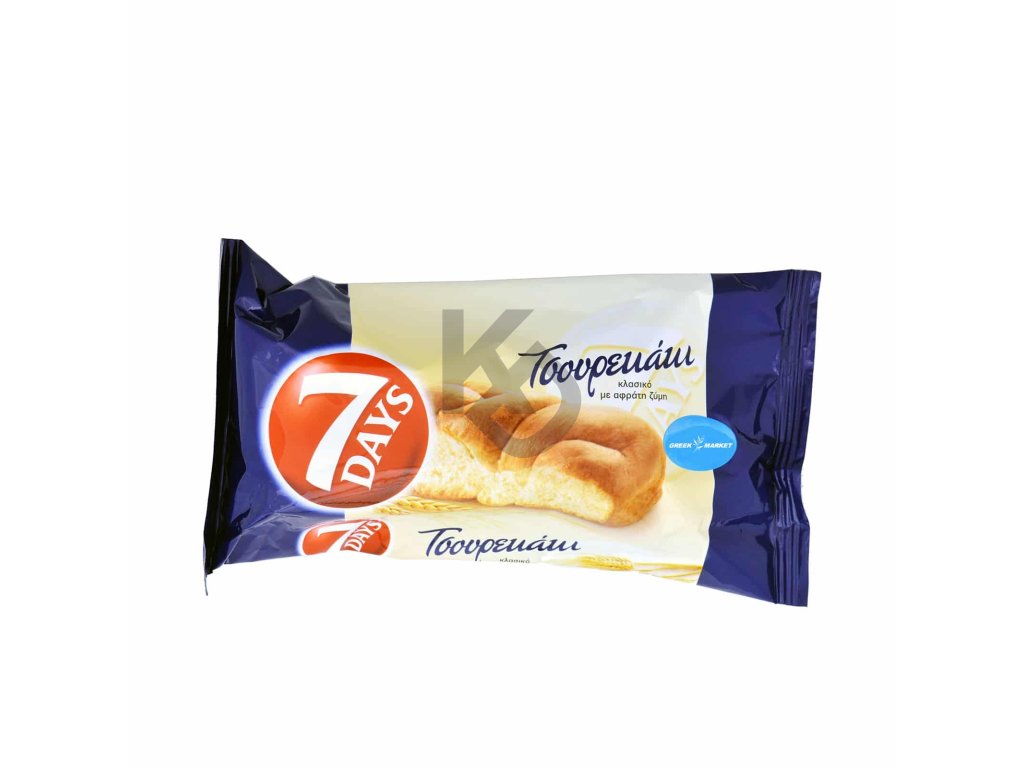 7 Days jemné pečivo Tsoureki 75g. SLOŽENÍ: Pšeničná mouka, cukr, rostlinný tuk (palmový olej), vejce, stabilizátory (sorbitol, mono- a glyceridy mastných kyselin), droždí, máslo, sušené odstředěné mléko, glukózo-fruktózový sirup, sůl, mahlep, etylalkohol, mastichový olej, mléčné bílkoviny, konzervant (propionát vápenatý 0,2 %). Může obsahovat stopy: arašídů, skořápkových plodů, sójových produktů. Minimální trvanlivost uvedená na obale. Výživové údaje na 100g: energie: 1516kJ/360kcal; tuky 11g z toho nasycené mastné kyseliny 6g; sacharidy 52g z toho cukry 16g; bílkoviny 12g; sůl 0,45g. Prodávající: KlauDa Trade s. r. o. Branická 213/53 Praha 4 - Braník 147 00. Země původu: Řecko