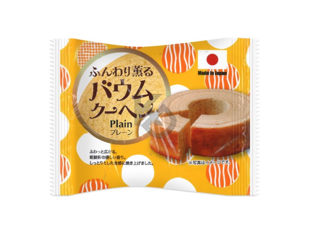 Jemně voňavý Baumkuchen Plain 60g. Složení: Vejce, mouka, cukr, tuk, sirup se sníženým obsahem škrobu, margarín, kukuřičný škrob, kypřicí látka, aroma (obsahuje pšenici, vejce, mléčné složky a sójové boby). Kalorie 187 kcal, bílkoviny 3,2 g, tuky 9,7 g, sacharidy 22,4 g, ekvivalent soli 0,2 g. Země původu: Japonsko. Prodávající: KlauDa Trade s. r. o. Branická 213/53 Praha 4 - Braník 147 00. Minimální trvanlivost: viz obal