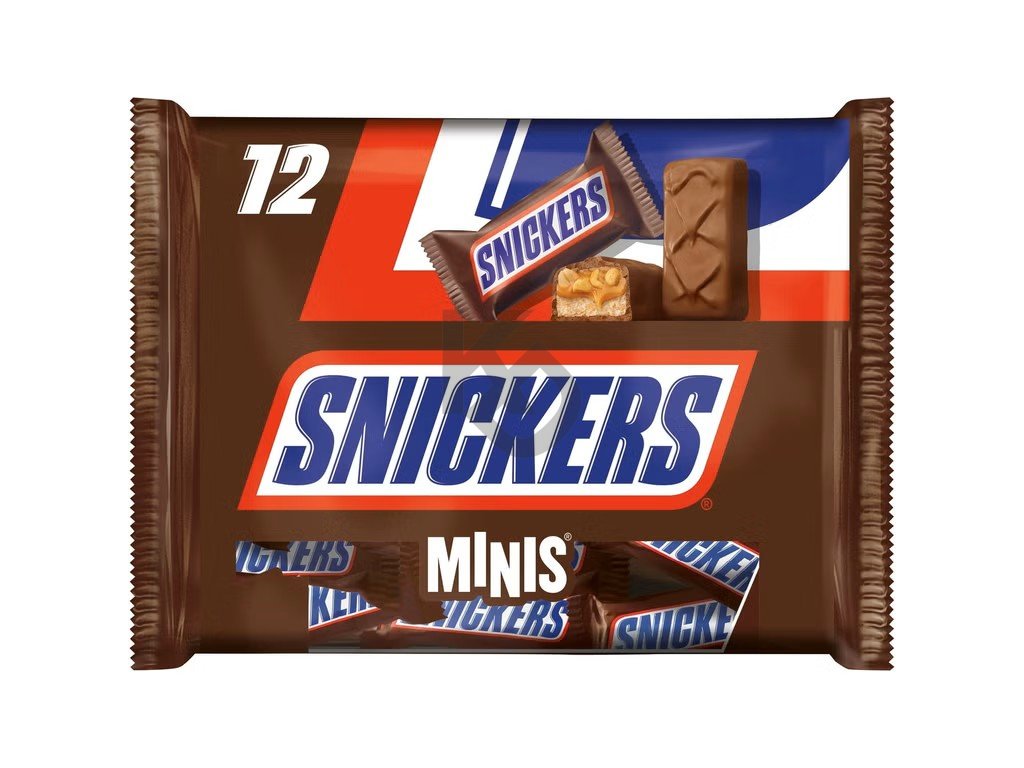 Snickers Minis 227g. Mléčná čokoláda (35 %) plněná jemným nugátovým krémem (14 %) a karamelem (28 %) s arašídy (22 %). Složení: cukr, glukózový sirup, arašídy, sušené odstředěné mléko, kakaové máslo, kakaová hmota, syrovátkový permeát (mléko), slunečnicový olej, mléčný tuk, palmový tuk, sůl, emulgátor (sójový lecitin), vaječný bílek v prášku. Může obsahovat jiné ořechy. Výživové údaje na 100 g: energie 2049 kJ / 489 kcal, tuky 27 g, z toho nasycené mastné kyseliny 6 g, sacharidy 60 g, z toho cukry 51 g, bílkoviny 8,6 g, sůl 0,52 g. Výrobce: Mars Nederland B.V. Postbus 81, 5460 AB Veghel, NL. Prodávající: KlauDa Trade s. r. o. Branická 213/53 Praha 4 - Braník 147 00.